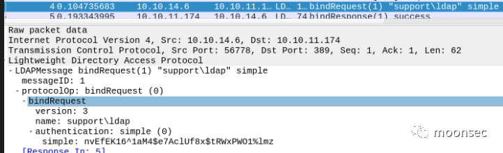 使用Wireshark 在“bindRequest”的数据包中看到: