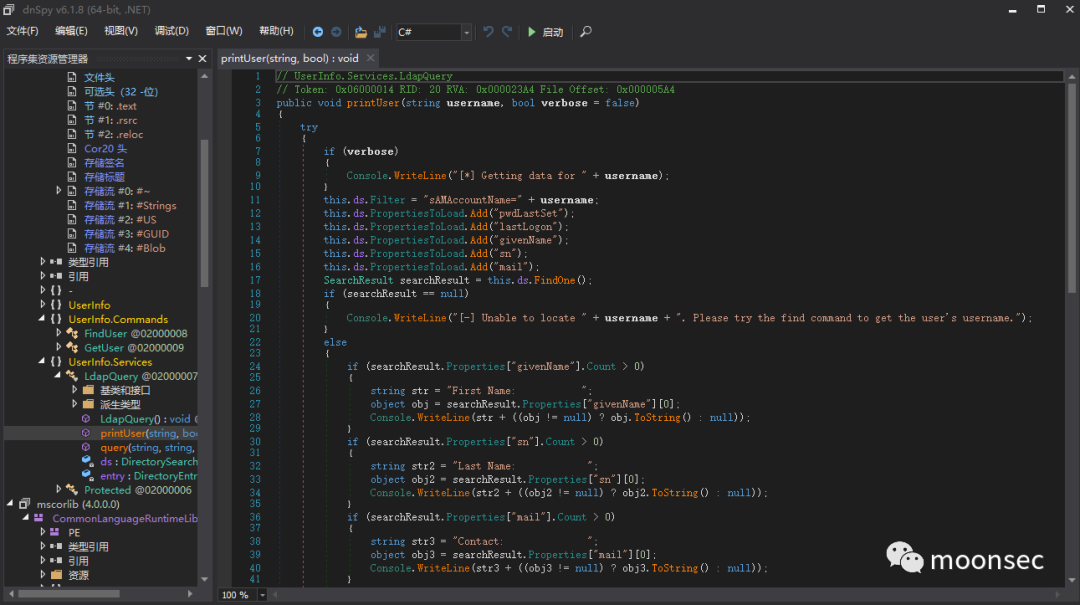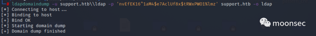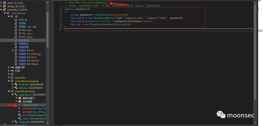 LdapQuery似乎是一个很好的起点。有两个函数printUser和query,它们可能与这两个命令匹配。显示它正在加载密码,然后使用用户 SUPPORT\ldap 和该密码连接到 LDAP。