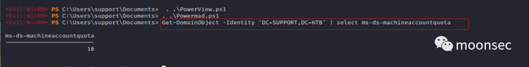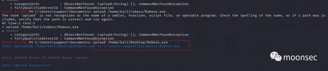 我们首先需要连接到“dc.support.htb”服务器;使用相同的 Evil-WinRM 会话连接。连接后,将我们需要的两个工具上传到服务器上,Powermad和Rubeus。上传后,我们将执行以下操作。