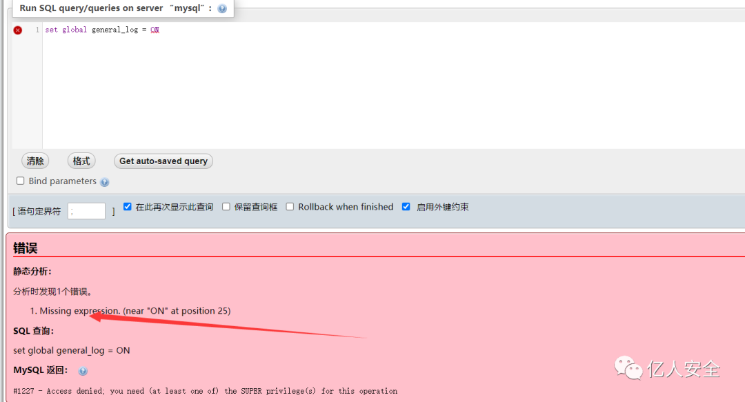尝试将general log改为yes,提醒我们没有权限,好吧,日志文件getshell这条路是行不通了