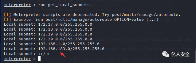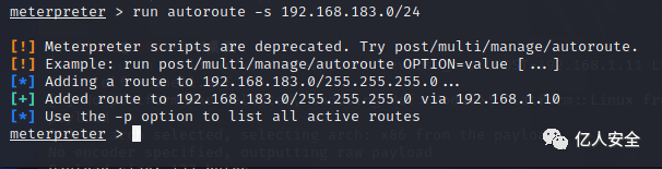 添加路由 命令:run autoroute -s 192.168.183.0/24