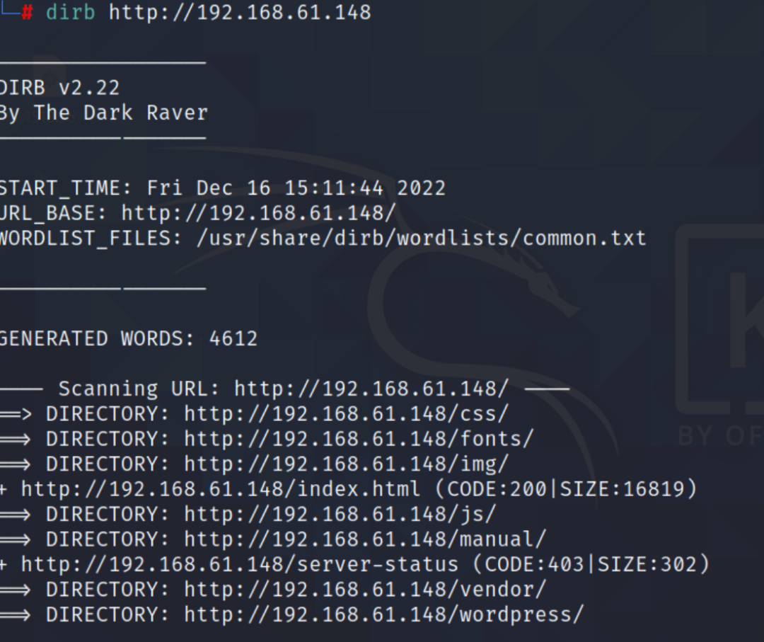 目录扫描(dirb)发现靶机是wordpress建站(可以用wpscan扫描有没有wordpress漏洞)