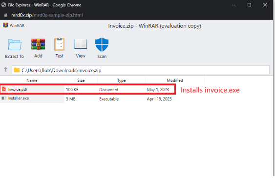 一个有趣的应用程序涉及列出一个不可执行的文件,当用户点击时,触发下载一个可执行文件或任何期望的文件格式,例如 .exe,即使用户期望下载“invoice.pdf”文件。