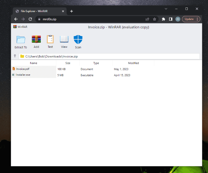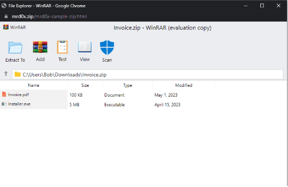 一种新的钓鱼工具包,“浏览器中的文件压缩器”,利用 ZIP 域名,在浏览器中呈现虚假的 WinRAR 或 Windows 文件管理器窗口,欺骗用户执行恶意文件。