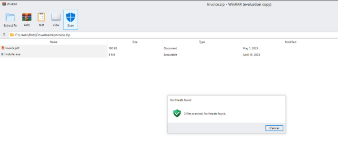 WinRAR 样本包含一些装饰性功能,例如生成确认文件安全的消息框的“扫描”图标,从而增强网络钓鱼页面的合法性。