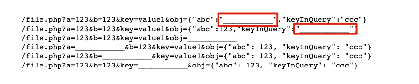 GET /file.php?a=123&&b=123&&key=value1&&obj=%7B%22abc%22%3A+123%2C+%22keyInQuery%22%3A+%22ccc%22%7D HTTP/1.1Host: www.example.comUser-Agent: Mozilla/5.0 (Windows NT 10.0; Win64; x64) ... Chrome/83.0.4103.116