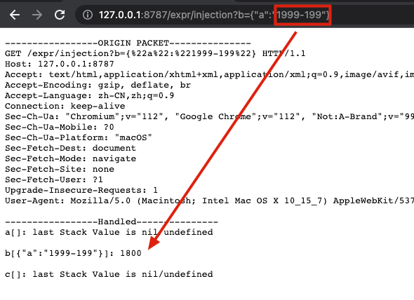 [INFO] 2023-05-15 14:25:56 [http_pool:612] start to send to http://127.0.0.1:8787/expr/injection?b=%7B%22a%22%3A%222011-03-9%22%7D(:0) (packet mode)----------------------------------------------------------------------------------表达式执行--------------------------------------------------------------------------------HTTP/1.1 200 OKDate: Mon, 15 May 2023 06:25:56 GMTContent-Type: text/plain; charset=utf-8Content-Length: 282-----------------ORIGIN PACKET---------------GET /expr/injection?b=%7B%22a%22%3A%222011-03-9%22%7D HTTP/1.1Host: 127.0.0.1:8787-----------------Handled---------------a[]: last Stack Value is nil/undefinedb[{"a":"2011-03-9"}]: 1999c[]: last Stack Value is nil/undefined[INFO] 2023-05-15 14:25:56 [http_pool:612] start to send to http://127.0.0.1:8787/expr/injection?b=2018-05-9(:0) (packet mode)