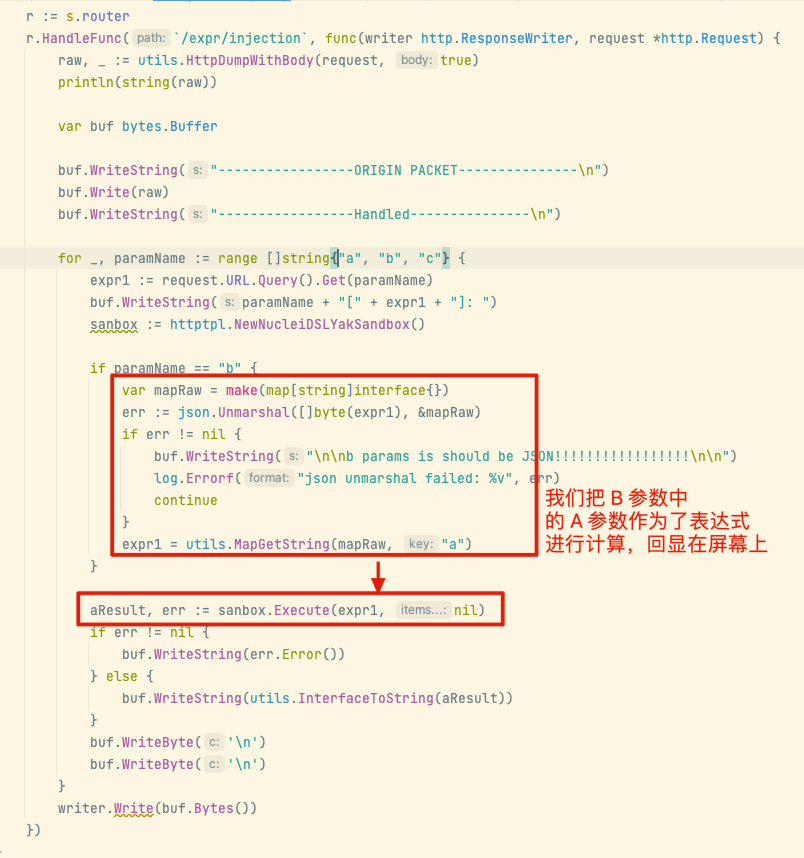 我们首先手造了一个 /expr/injection 的路由,其中有三个参数,我们把 b 参数中的内容作为 JSON 进行反序列化,并且把 JSON 后对象的 "a" 参数取出来。然后把 “a” 的内容作为一个沙箱表达式进行执行。