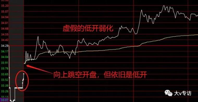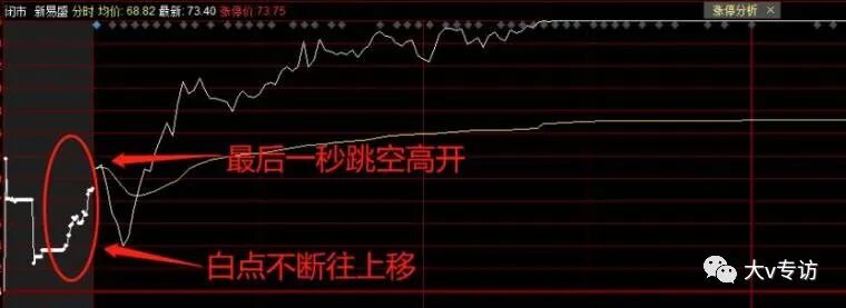 还有一种竞价也可以留意,虚假的低开弱化,名字完全相反,原理跟真实的高开强化差不多,9:20到9:25这段时间内,白点不断往上移动,最后一笔跳空向上,但是结果相反,虚假的的低开弱化的股价在竞价期间是负的,也就是是说它始终在水下运行,我们来看案例:
