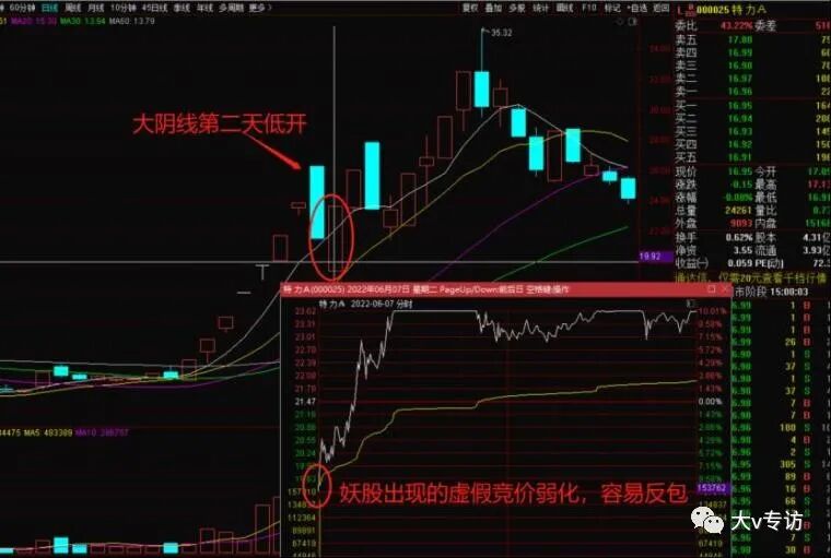 这种竞价方式跟真实的高开强化意义有什么不同?打个比方,真实的高开强化就像你在一堆美女里面选一个最好看的出来,而虚假的竞价弱化是在一堆丑的里面选选一个好看的。因此,从成功率角度来看,真实的高开强化会更好,从盈亏比角度来看,虚假的低开弱化会更好。虚假的低开弱化经常出现在核按钮里面,因此,这种情况要留意,成功率比较低,很多都不值得做。