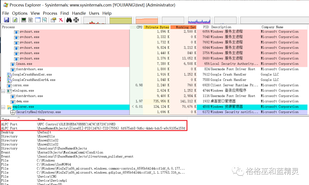 Windows本地调用(LPC,Local Procedure Call)简单介绍,通常也被称为轻量过程调用或者本地进程间通信,是一种由Windows NT内核提供的内部进程间通信方式。通过这一方式,同一计算机上的进程可以进行轻量的通信。在Windows Vista中及以后,ALPC(Advanced Local Procedure Call,高级本地进程通信)替代了LPC。ALPC十分复杂,还被非常多的应用所使用,如RPC、WMI、COM组件、打印机等。即使最简单的windows程序都会有ALPC连接。可以用ProcessExplorer查看每个进程的ALPC Port的名字。例如: