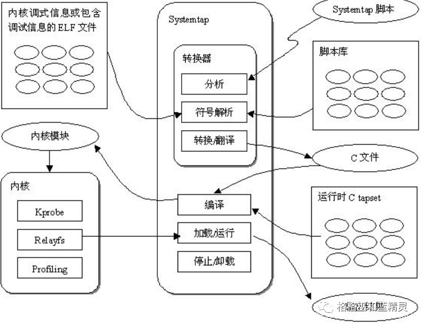 SystemTap 的工作原理是将脚本翻译成C语言,执行C编译器创建一个内核模块。当模块被加载后,通过挂载到内核来激活所有的探测事件。然后,当事件发生再任何处理器上时,编译后的处理程序就运行,最终,SystemTap会话停止,Hook取消,内核模块被移除,整个过程由命令行程序stap驱动。