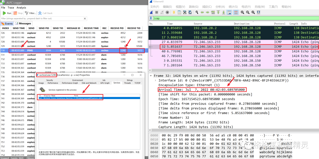 运行AlpcLogger和wireshark,前者负责监控谁对nsi服务宿主进程svchost发送调用,后者监控ICMP流量,然后以时间为纽带,关联到一起。我们以ping为例,捕获效果如图: