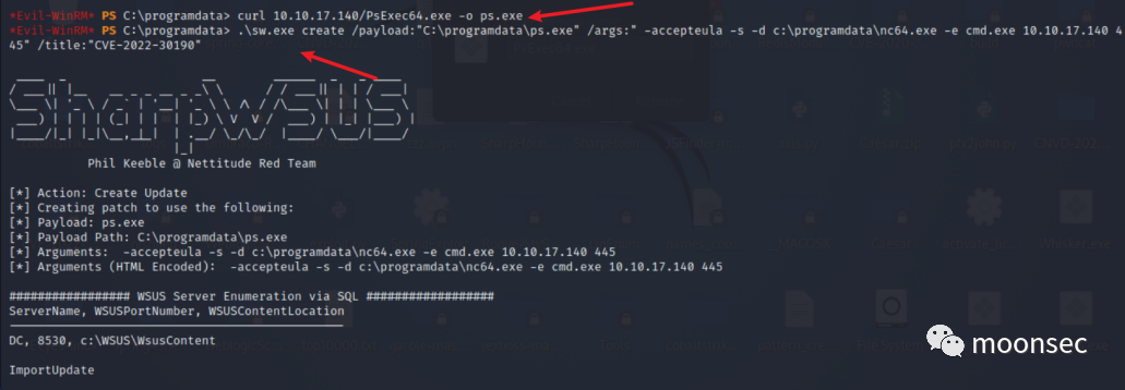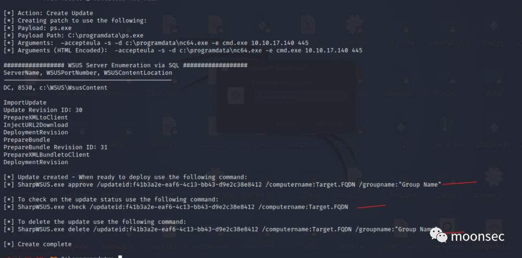 使用SharpWSUS.exe. 我将使用nc64.exe. 对于PsExec/args,它不会弹出框并等待单击、作为系统运行并立即返回。