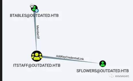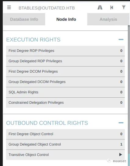 打开 Bloodhound,清除数据库,然后上传 Zip 文件。我将搜索 btables 并将它们标记为已拥有。仔细观察btables,他们在“出站控制权”下有一个“Group Delegated Object Control”: