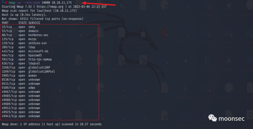 信息收集端口扫描使用nmap进行端口探测,发现开放了大量端口。通过扫描结果中提到的一些服务是25/SMTP、53/DNS、389/LDAP、445/SMB和5985/WinRM。这些服务的存在表明这台