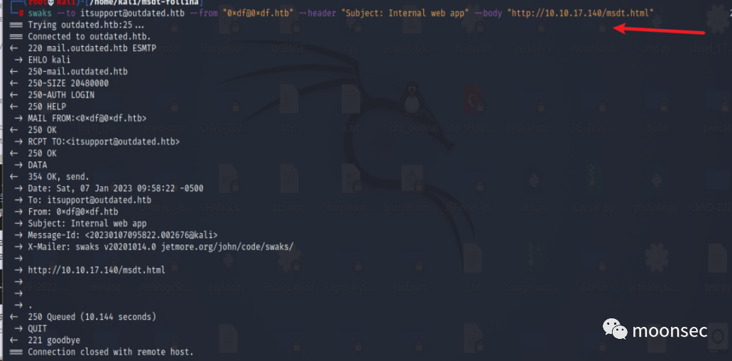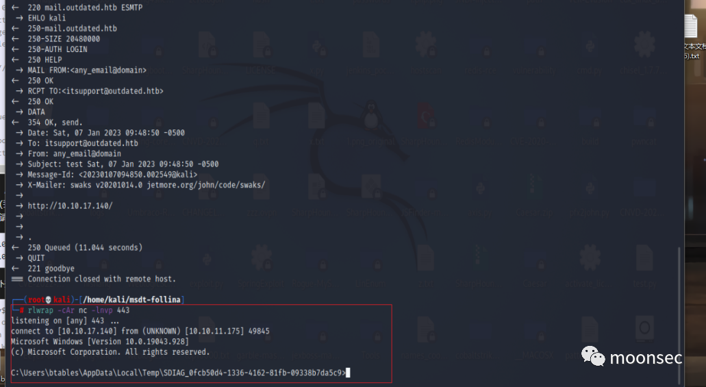 我将向[email protected]笔记中注明的电子邮件地址发送一封电子邮件,其中包含指向 Folina 漏洞利用的链接。通常,Folina 被打包在一个 word 文档中,以真正解决弹出窗口等问题。为了解决 Outdated,我只需要使用一个使用 JavaScript 重定向到msdt://URL 的 HTML 页面。