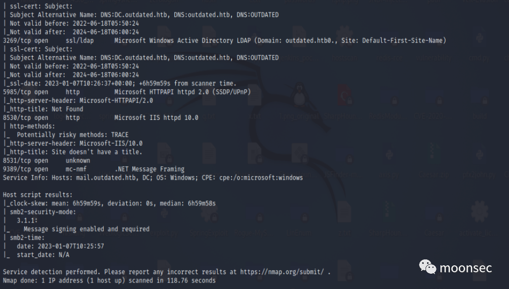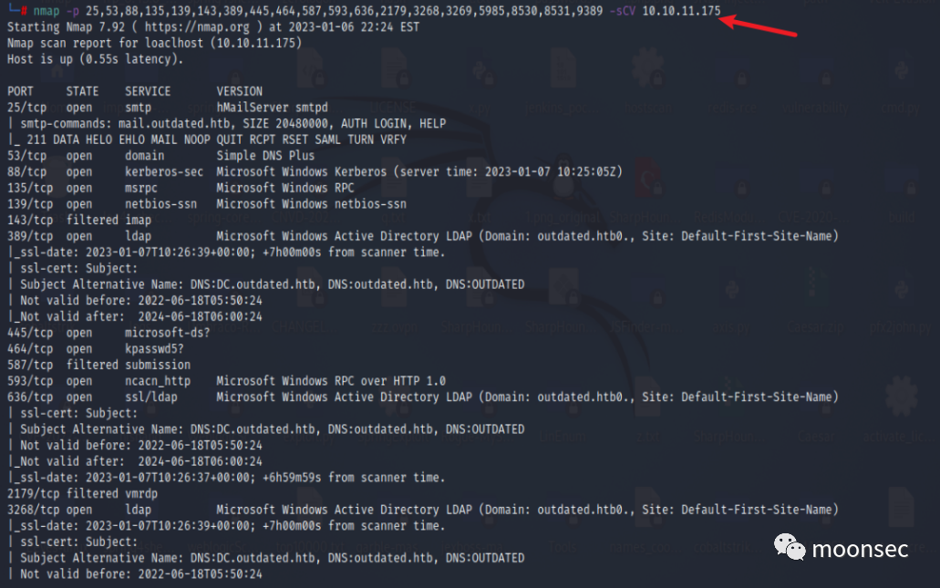 nmapmail.outdated.htb还在TCP 25 和dc.outdated.htbLDAPoutdated.htb端口(636、3268、3269)上认证的 TLS 上 识别了主机名。