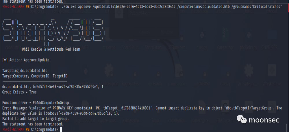 .\sw.exe approve /updateid:f41b3a2e-eaf6-4c13-bb43-d9e2c38e8412/computername:dc.outdated.htb /groupname:"CriticalPatches"