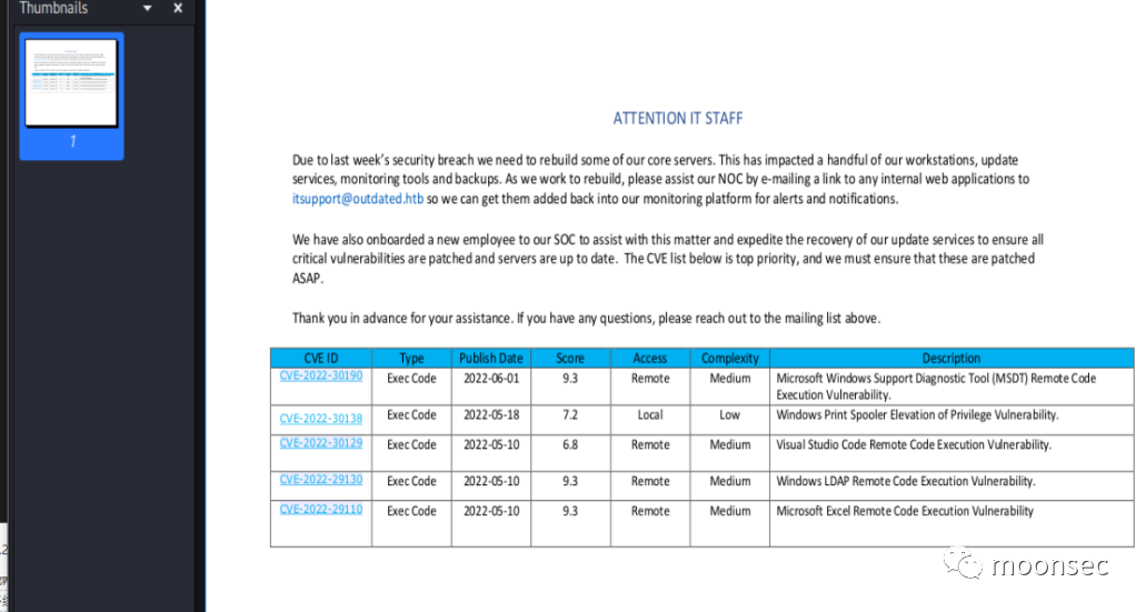 ●CVE-2022-29110 - Excel 中的 RCE。在发布时,我找不到任何关于此漏洞利用的 POC,也没有迹象表明盒子上安装了 Excel。