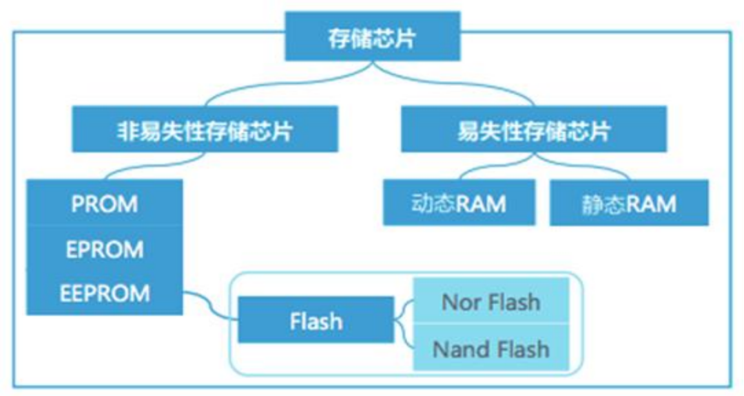 存储芯片,也叫存储器,是用来存储程序和各种数据信息的记忆部件。根据断电后数据是否被保存,可分为 ROM(非易失性存储芯片)和RAM(易失性存储芯片),即闪存和内存,其中闪存包括NAND Flash和NOR Flash,内存主要为DRAM。