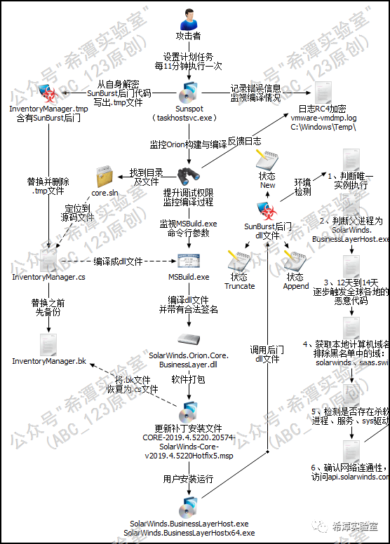 一旦发现SolarWinds.Orion.Core.BusinessLayer.dll出现在服务器上,立即将合法源码文件重命名,替换成含有后门Sunburst版本的dll文件,整个过程只有几秒钟的时间,实现难度非常大,同时也说明攻击者事先做了多么充足的准备,也间接理解了该APT组织为何耗时一年的时间来测试。然后Sunspot会将原有合法的dll文件恢复,从所有虚拟机中将自身删除,清理痕迹。