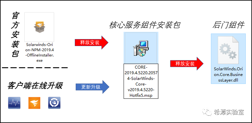 经过长达几个月的评估和分析,该APT组织制定了一个疯狂的计划:在Solarwinds网管软件Orion的源码中植入后门代码,这样生成的更新包由于带有Solarwinds的正常的数字签名,可以绕过各种杀软防护,等到Solarwinds公司给客户下发Orion软件更新包时,就可以获取旗下数万家客户公司的全部权限,这就是上游供应链攻击的巨大威力。