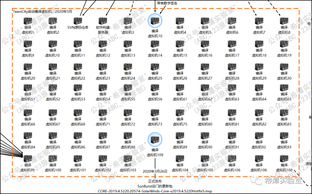 2020年3月份,Solarwinds开发人员开始使用JetBrains公司出品的TeamCity(TeamCity是捷克软件开发公司提供的构建管理和持续集成服务器)构建Orion的软件更新包,该编译软件启动了100多个编译虚拟机,这些虚拟机是临时创建的,一旦编译工作结束就会自我销毁。此时攻击者遇到了麻烦,每台编译虚拟机各自负责编译Orion网管软件的不同模块的代码,他们不知道哪一台编译虚拟机会编译SolarWinds.Orion.Core.BusinessLayer.dll文件或者打包此dll文件。