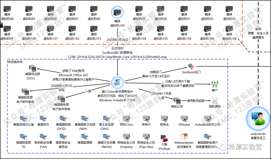 首先放出一张ABC_123绘制的关于Solarwinds供应链攻击美国关键基础设施的流程图,是从大量的国内外关于此次攻击事件的报道中归纳整理出来的,接下来依据此流程图,详细讲解整个入侵流程。