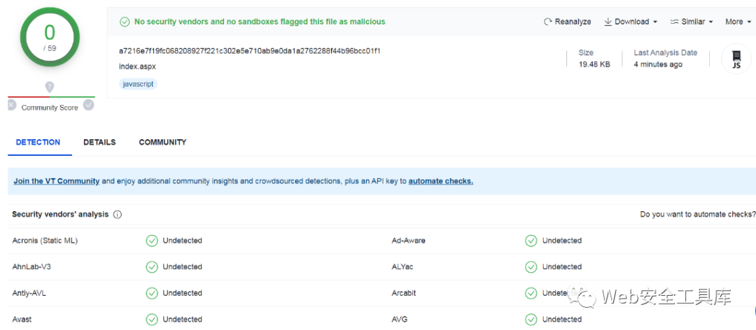 [BypassNeoASPX.py]\-VT查杀0报毒:https://www.virustotal.com/gui/file/a7216e7f19fc068208927f221c302e5e710ab9e0da1a2762288f44b96bcc01f1?nocache=1\-修改默认文本内容 NeoGeorg says, 'All seems fine' => NEO, 'All OK'\-aspx免杀处理( https://xz.aliyun.com/t/11953 )[neoreg.py]\-修改默认文本内容 NeoGeorg says, 'All seems fine' => NEO, 'All OK'