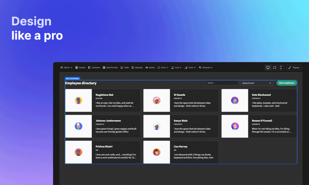 Budibase 开箱即用,带有设计精美、功能强大的组件,您可以像构建块一样使用这些组件来构建您的 UI。我们还公开了许多您最喜欢的 CSS 样式选项,因此您可以更进一步地发挥创意。