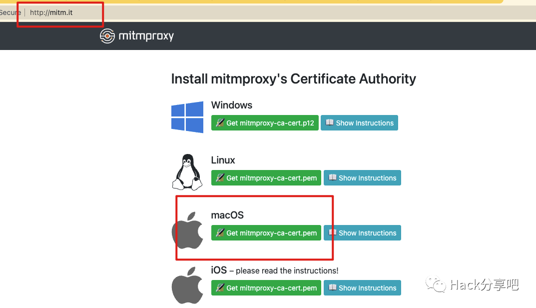 使用SwitchOmega等插件连接该代理,并访问mitm.it即可进入证书安装页面,根据操作系统进行证书安装。