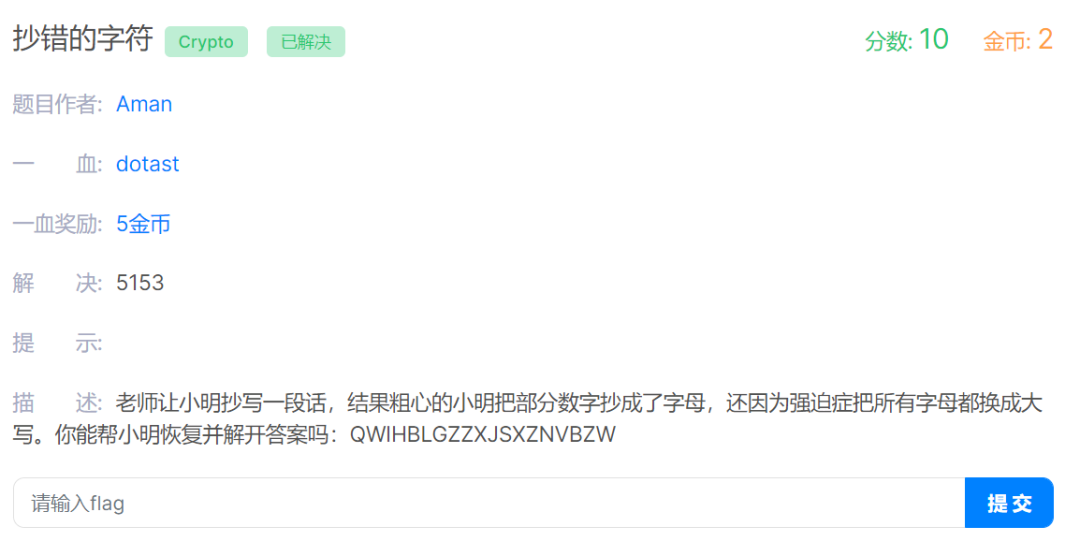 https://ctf.bugku.com/challenges/detail/id/186.html老师让小明抄写一段话,结果粗心的小明把部分数字抄成了字母,还因为强迫症把所有字母都换成大写。你能帮小明恢复并解开答案吗:QWIHBLGZZXJSXZNVBZW