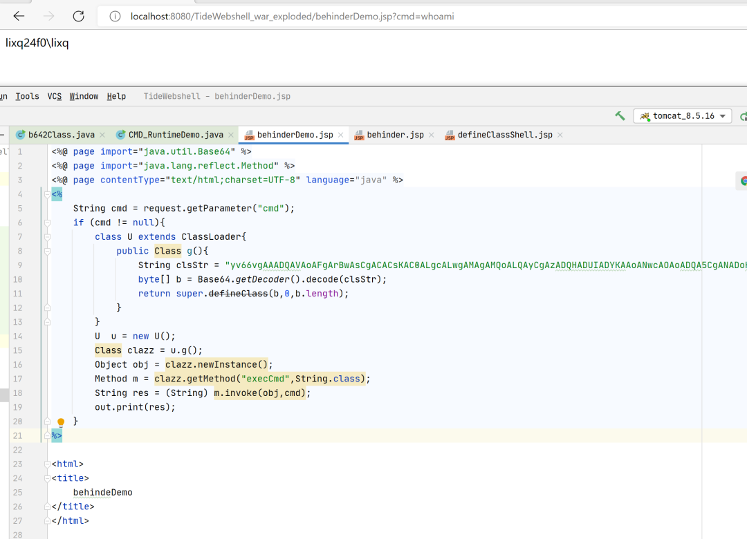 有了以上基础,着手将一开始的CMD Webshell改为自定义类加载器方式执行:相较于传统自定义类加载器的方式,冰蝎更直接地调用defineClass方法将编码后class文件还原为Class对象,参照冰蝎的方式可以依照如下步骤来实现CMD Webshell。1、首先将CMD JSP Webshell编译为class,然后将class文件base64编码