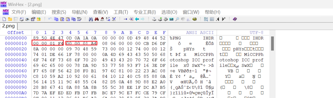 1. 开头的0~7八个字节为png的文件头:89 50 4E 47 0D 0A 1A 0A (固定格式)2. 8~11四个字节:00 00 00 0D 表示头部数据块的长度为13(固定格式)3. 12~15四个字节:49 48 44 52 表示文件头数据块的标示(固定格式)4. 16~19四个字节:00 00 01 F4表示图片的宽(不固定)5. 20~23四个字节:00 00 01 F4表示图片的高(不固定)6. 24~28五个字节:08 06 00 00 00表示Bit depth(图像深度)、ColorType(颜色类型)、 Compression method(压缩方法)、 Filter method(滤波器方法)、Interlace method(隔行扫描方法)这五个字节不固定,均为可变数据7. 29~32四个字节:CB D6 DF 8A为图片的crc校验值由从第12个字节到第28个字节的十七位字节进行crc计算得到