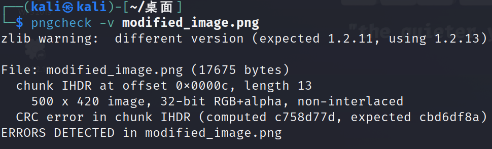import binasciiimport structimport threadingcrcbp = open("2.png", "rb").read() # 打开图片crc32frombp = int(crcbp[29:33].hex(), 16) # 读取图片中的CRC校验值print(crc32frombp)class SizeFinder(threading.Thread):def __init__(self, start_width, end_width):super(SizeFinder, self).__init__()self.start_width = start_widthself.end_width = end_widthdef run(self):for i in range(self.start_width, self.end_width):try:for j in range(4000):data = crcbp[12:16] + \struct.pack('>i', i) + struct.pack('>i', j) + crcbp[24:29]crc32 = binascii.crc32(data) & 0xffffffffif crc32 == crc32frombp:print(i, j)print('hex:', hex(i), hex(j))returnexcept Exception as e:print(f"An error occurred: {e}")def find_size():threads = []num_threads = 8 # 设置线程数width_range = 4000chunk_size = width_range // num_threadsfor i in range(num_threads):start_width = i * chunk_sizeend_width = (i + 1) * chunk_size if i < num_threads - 1 else width_rangethread = SizeFinder(start_width, end_width)threads.append(thread)thread.start()for thread in threads:thread.join()if __name__ == '__main__':find_size()