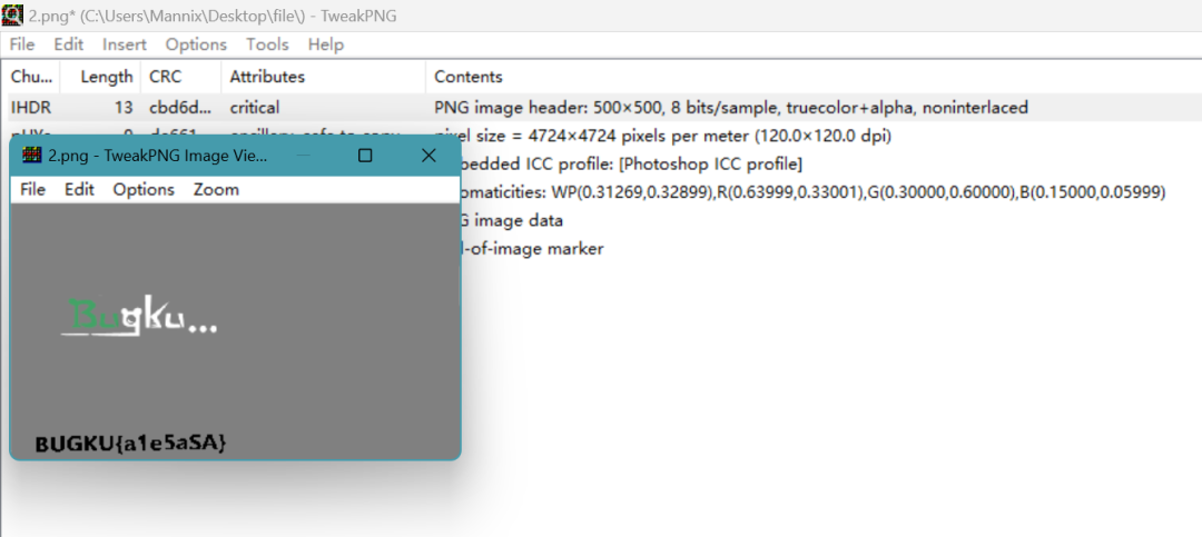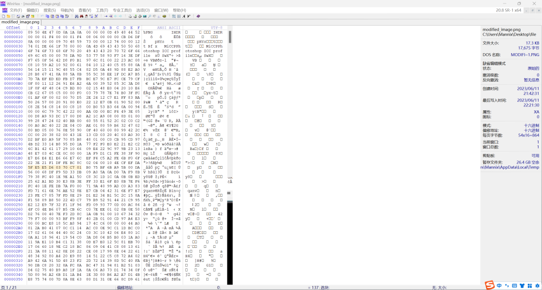 https://ctf.bugku.com/challenges/detail/id/3.html根据png的格式进行查看,第一行是png的pe头,第二行是png的宽和高,将第二行宽和高修改为相同,就可以了。(固定)八个字节89 50 4E 47 0D 0A 1A 0A为png的文件头 (固定)四个字节00 00 00 0D 代表数据块的长度为13 (固定)四个字节49 48 44 52(即为ASCII码的IHDR)是文件头数据块的标示(IDCH) (可变)13位数据块(IHDR)