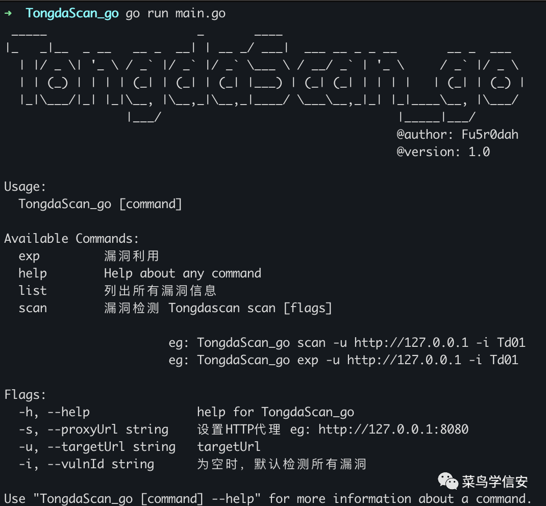 TongdaScan_go scan -u http://1.1.1.1 -i Td01 -s http://127.0.0.1:8080如果您下载、安装、使用、修改本程序及相关代码,即表明您信任本程序。在使用本程序时造成对您自己或他人任何形式的损失和伤害,作者、本公众号不承担任何责任。如您在使用本程序的过程中存在任何非法行为,您需自行承担相应后果。