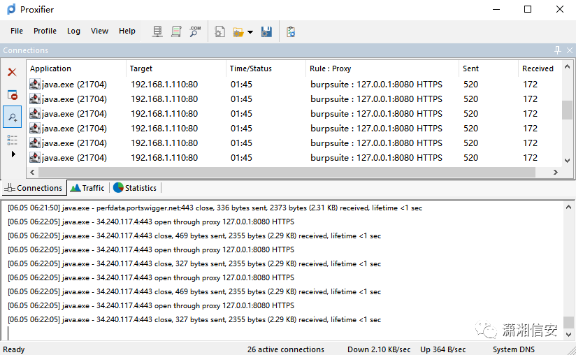 Applications输入要代理的进程,如:java.exe,Action选择刚添加的HTTPS代理。这里以前段时间分享的Exp-Tools项目为例来演示,从下图中可以看到已经成功抓取到了该工具验证漏洞时提交的POC数据包,N!9个OA高危漏洞利用工具v1.1.6。