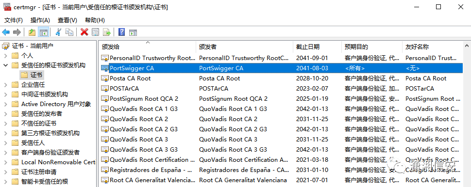 Win+R运行输入certmgr.msc,找到“受信任的根证书颁发机构”证书右键->所有任务->导入->把刚下载的cacert.der导入进去,选择“所有文件(*.*)”。