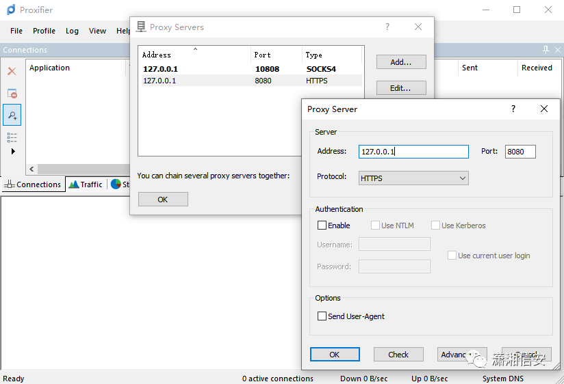 我们继续设置Proxifier,Profile->Proxy Servers...->Add添加一个HTTPS代理,填入Burpsuite监听的IP地址和端口即可。