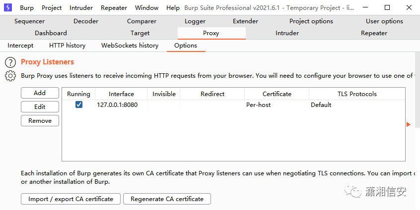首先我们打开Burpsuite,Proxy->Proxy Listeners->Options添加一个代理服务器和端口,但得注意下不要使用已被占用的端口,否则可能会监听失败。